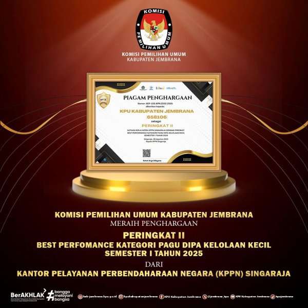 Penghargaan ini diberikan atas kinerja optimal KPU Jembrana dalam pengelolaan anggaran negara secara tertib, transparan, dan akuntabel. Capaian tersebut sekaligus menjadi bukti komitmen KPU Jembrana dalam menjaga kepercayaan publik melalui tata kelola keuangan yang baik.