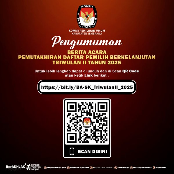 Berikut kami umumkan Berita Acara dan Surat Keputusan KPU Kabupaten Jembrana Tentang Rekapitulasi dan Penetapan Pemutakhiran Data Pemilih Berkelanjutan Triwulan II Tahun 2025, dapat diunduh pada link berikut ini :