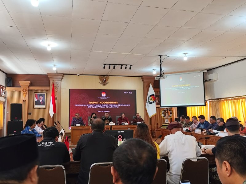 Denpasar – Komisi Pemilihan Umum (KPU) Kabupaten Jembrana mengikuti Rapat Koordinasi (Rakor) Persiapan Rekapitulasi Pleno Terbuka Triwulan III Tahun 2025 yang diselenggarakan oleh KPU Provinsi Bali, Rabu 1 Oktober 2025 di ruang rapat KPU Provinsi Bali.