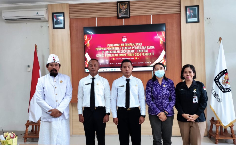 Komisi Pemilihan Umum (KPU) Kabupaten Jembrana mengikuti Pengambilan Sumpah dan Pelantikan Pegawai Pemerintah dengan Perjanjian Kerja (PPPK) Gelombang II Tahun 2024 yang dilaksanakan secara daring melalui Zoom Meeting oleh Sekretariat Jenderal KPU RI. Kegiatan ini berlangsung di Ruang Rapat KPU Kabupaten Jembrana.