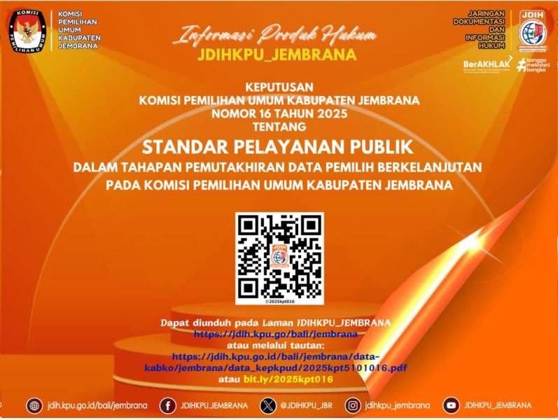 Jembrana — Komisi Pemilihan Umum (KPU) Kabupaten Jembrana resmi mempublikasikan Keputusan KPU Kabupaten Jembrana Nomor 16 Tahun 2025 tentang Standar Pelayanan Publik dalam Tahapan Pemutakhiran Data Pemilih Berkelanjutan (PDPB).