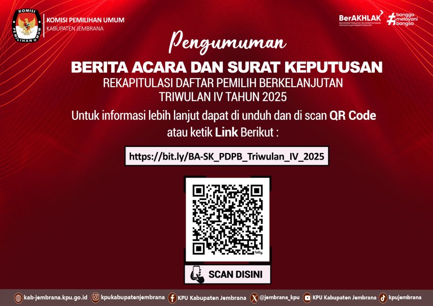 Berikut kami umumkan Berita Acara dan Surat Keputusan Rekapitulasi Daftar Pemilih Berkelanjutan Triwulan IV Tahun 2025, Dapat diunduh pada link berikut ini :