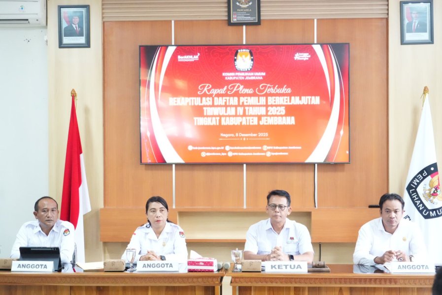 Jembrana — Komisi Pemilihan Umum (KPU) Kabupaten Jembrana melaksanakan Rapat Pleno Rekapitulasi Daftar Pemilih Berkelanjutan (PDPB) Triwulan IV Tahun 2025 Tingkat Kabupaten Jembrana pada Senin, 8 Desember 2025, sebagai bagian dari agenda rutin untuk memastikan daftar pemilih tersusun secara akurat, mutakhir, dan komprehensif. Rapat dibuka oleh Ketua KPU Kabupaten Jembrana, I Ketut Adi Sanjaya, dan dilaksanakan berdasarkan ketentuan PKPU Nomor 7 Tahun 2022, PKPU Nomor 7 Tahun 2024, serta PKPU Nomor 1 Tahun 2025.