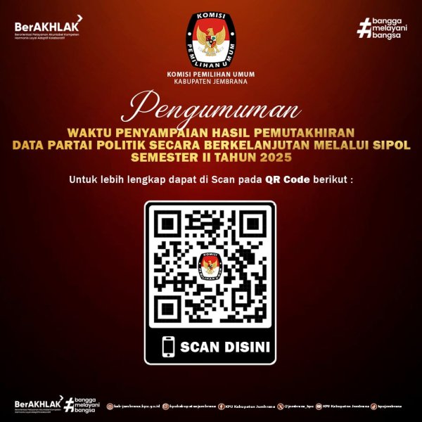 Dalam rangka melaksanakan ketentuan pemutakhiran data Partai Politik secara berkelanjutan, Komisi Pemilihan Umum Kabupaten Jembrana menyampaikan pengumuman terkait waktu penyampaian hasil Pemutakhiran Data Partai Politik melalui Aplikasi Sistem Informasi Partai Politik (SIPOL) Semester II Tahun 2025.
