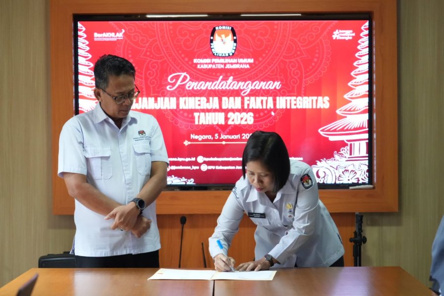 Negara – Sebagai wujud komitmen penguatan tata kelola kelembagaan yang profesional, akuntabel, dan berintegritas, KPU Kabupaten Jembrana melaksanakan Penandatanganan Perjanjian Kinerja dan Pakta Integritas Tahun 2026 pada Senin, 5 Januari 2026.