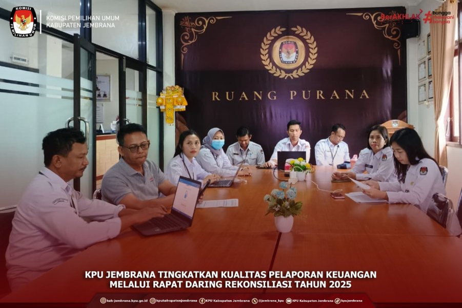 Komisi Pemilihan Umum (KPU) Kabupaten Jembrana mengikuti rapat daring rekonsiliasi dan pendampingan penyusunan laporan keuangan Tahun 2025 (unaudited) yang diselenggarakan oleh KPU Provinsi Bali, sebagai upaya meningkatkan kualitas dan akuntabilitas pelaporan keuangan.