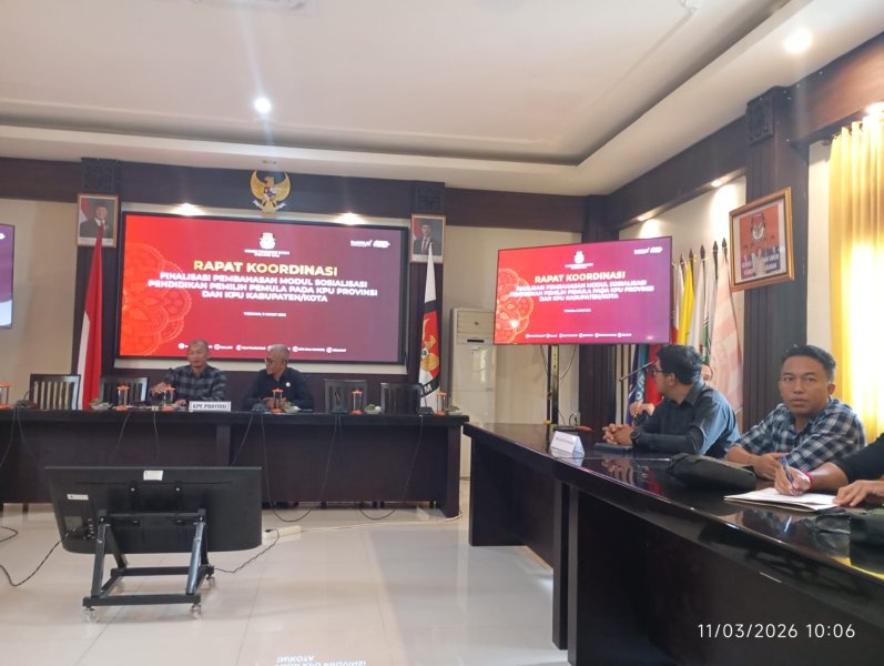 Dalam rangka memperkuat materi pendidikan pemilih bagi generasi muda, KPU Kabupaten Jembrana mengikuti kegiatan Rapat Koordinasi Finalisasi Modul Sosialisasi dan Pendidikan Pemilih (Sosdiklih) Pemilih Pemula yang diselenggarakan oleh KPU Provinsi Bali pada Rabu, 11 Maret 2026. Kegiatan tersebut dilaksanakan di ruang rapat KPU Kabupaten Tabanan dan diikuti oleh seluruh Anggota KPU yang membidangi Divisi Partisipasi Masyarakat, Sosialisasi Pendidikan Pemilih dan SDM dari KPU Provinsi Bali serta KPU Kabupaten/Kota se-Bali.