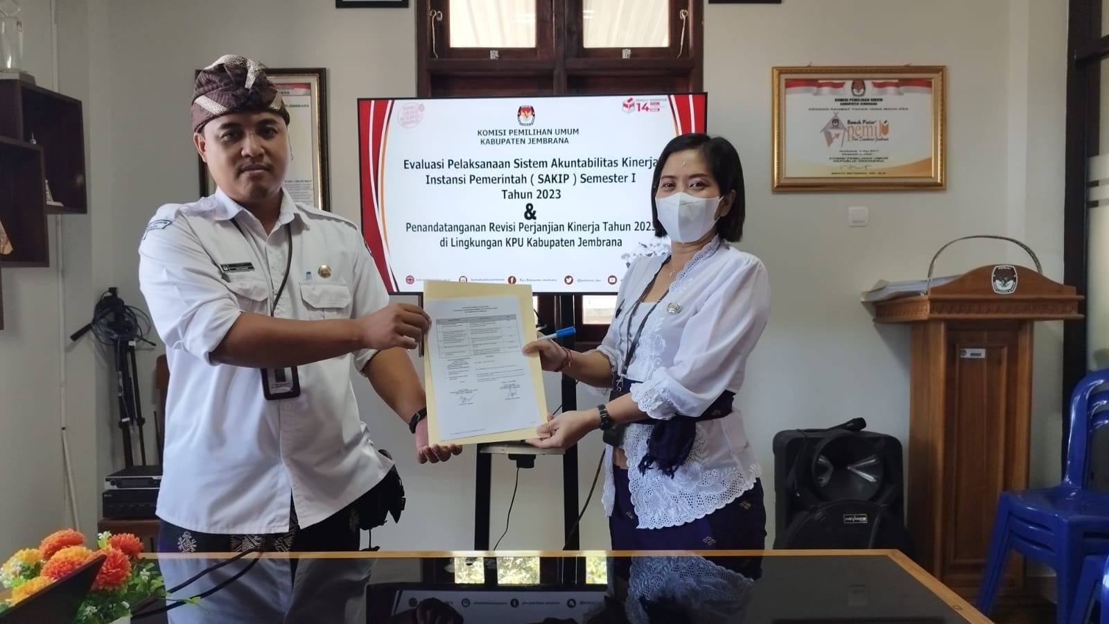 Selanjutnya, kegiatan dilanjutkan dengan penandatanganan revisi perjanjian kinerja tahun 2023 di lingkungan KPU Kabupaten Jembrana oleh Komisioner KPU Jembrana , yang diikuti oleh Sekretaris dan seluruh Kasubbag KPU Jembrana. Penandatanganan revisi perjanjian kinerja ini dilakukan guna memastikan bahwa semua pihak terlibat memiliki pemahaman yang sama mengenai tujuan dan target kinerja yang harus dicapai dalam setiap aktivitas yang dilakukan oleh KPU Jembrana.