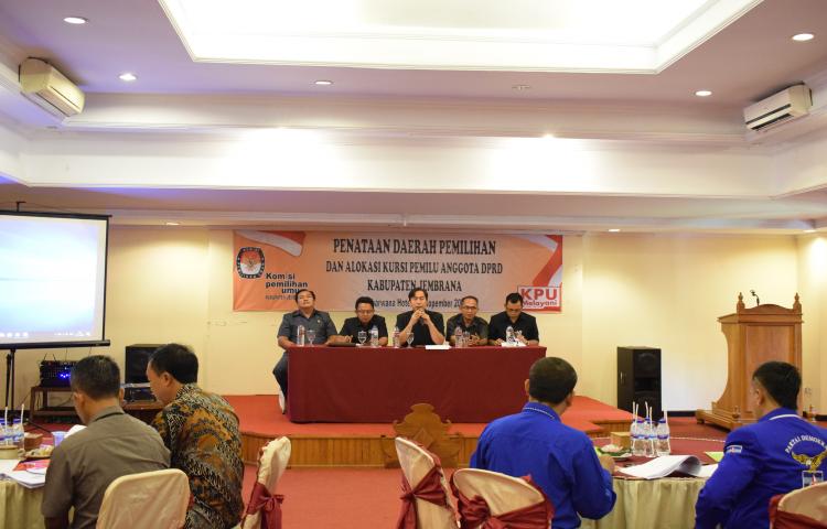 KPU Jembrana melaksanakan Focus Group Discussion (FGD) Penataan Daerah Pemilihan dan Alokasi Kursi Pemilu DPRD Kabupaten Jembrana di Hotel Jimbarwana dihadiri oleh Lembaga Keagamaan (PHDI, MUI, PAROKI, WALUBI), Kesbangpol Kabupaten Jembrana, Panwaslu Kabupaten Jembrana, Camat se-Jembrana, dan Partai Politik. Acara dimulai pada pukul 09.00 WITA dengan Registrasi Peserta di lanjutkan pembukaan acara dengan menyanyikan lagu Kebangsaan Indosesia Raya dan Doa. Ketua KPU Jembrana I Gusti Ngurah Agus Darmasanjaya dalam sambutannya, berharap acara Focus Group Discussion (FGD) sebagai wadah berpendapat karena sangat penting dalam penyelenggaraan pemilu. Pemberi materi dalam acara ini I Nengah Suardana Divisi Hukum KPU Jembrana dengan materinya Sosialisasi Pendaftaran Calon Peserta Pemilu Tahun 2019 dan I Ketut Gde Tangkas Sudiantara Divisi Teknis KPU Jembrana dengan materinya Penataan Dapil dan Alokasi Kursi Pemilu Anggota DPRD Kabupaten Jembrana serta simulasi Dapil.