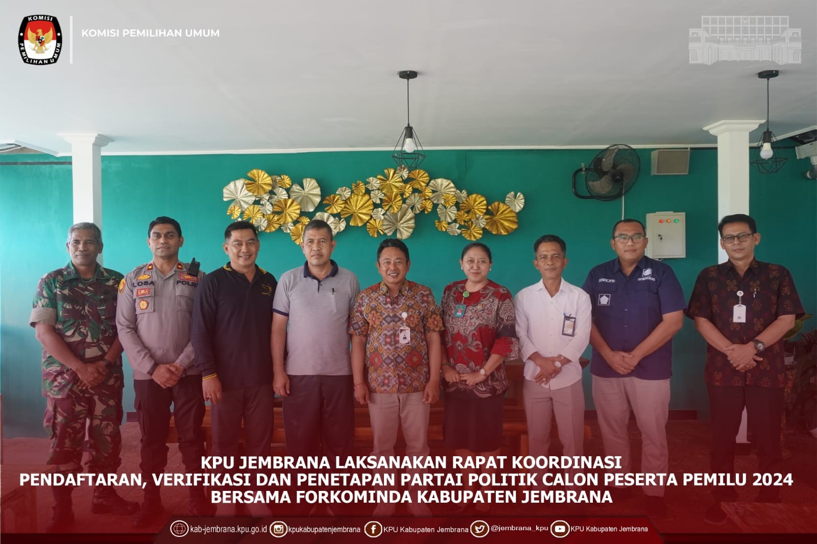 #TemanPemilih – Jembrana, Jumat (16/09). KPU Jembrana melaksanakan Rapat Koordinasi ( Rakor) bersama Forkominda Kabupaten Jembrana terkait Pendaftaran, Verifikasi dan Penetapan Parpol Calon Peserta Pemilu Tahun 2024. Kegiatan yang dilaksanakan di Nirwana Garden Jl. Sawe Rangsasa, Dauhwaru, Kec. Jembrana, Kabupaten Jembrana. Kegiatan mengundang stake holder Forkominda yakni Polres Jembrana,Kodim 1617 Jembrana, Pengadilan Negeri Jembrana, Kejaksaan Negeri Jembrana, Pemerintah Daerah Kabupaten Jembrana dan Badan Kesbangpol Jembrana serta Bawaslu Jembrana.