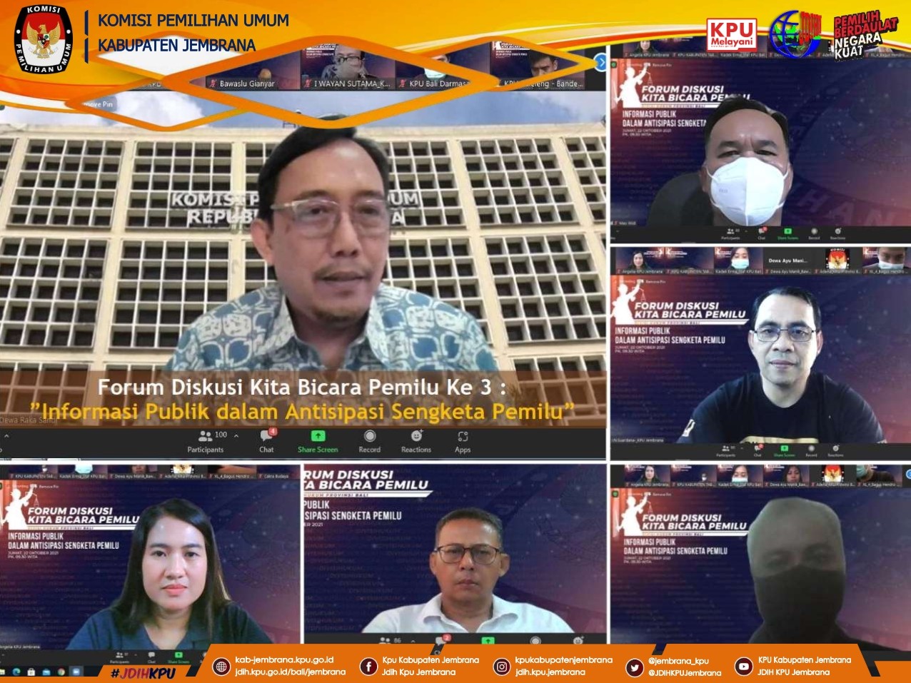 Inilah untuk kali ketiga, KPU Provinsi Bali menggelar kegiatan yang diprakarsai oleh Divisi Hukum dan Pengawasan KPU Provinsi Bali berupa Forum Diskusi Kita Bicara Pemilu yang bertajuk ”Informasi Publik dalam Antisipasi Sengketa Pemilu” dengan menggunakan media dalam jaringan (daring).