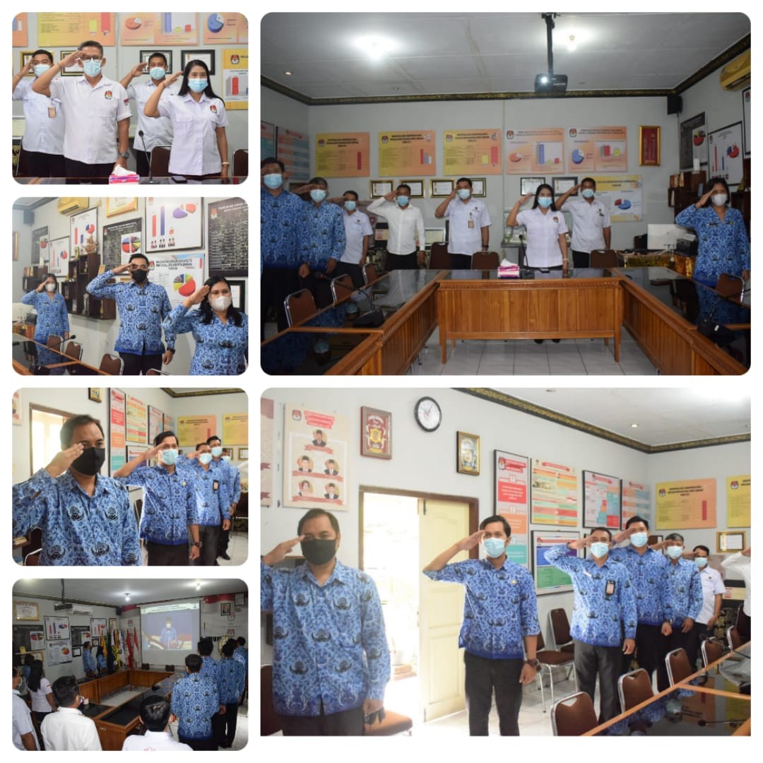 Dalam rangka Ulang Tahun KORPRI ke 50 , KPU Jembrana melaksanakan upacara peringatan dengan mengikuti upacara secara Hybrid yang terpusat di manggala Wana Bakti, Kementrian Lingkungan Hidup dan Kehutanan secara virtual. Pelaksanaan Peringatan diawali dengan Upacara Rutin di halaman Kantor KPU Jembrana selanjutnya Upacara HUT KORPRI dilaksanakan di Ruang RPP Puri Demokrasi Jembrana diikuti oleh Komisioner, Pegawai ASN dan Pegawai PPNPN. Sesuai dengan surat edaran KPU RI Nomor 17 tahun 2021, KPU Jembrana dalam rangkaian HUT KORPRI juga melaksanakan sebelumnya kegiatan dengan persembahyangan bersama (18/11/2021) dengan segenap jajaran KPU Jembrana dan bakti sosial pembersihan pantai perancak dari sampah plastik (25/11/2021). (dewa oka.red/hupmas)