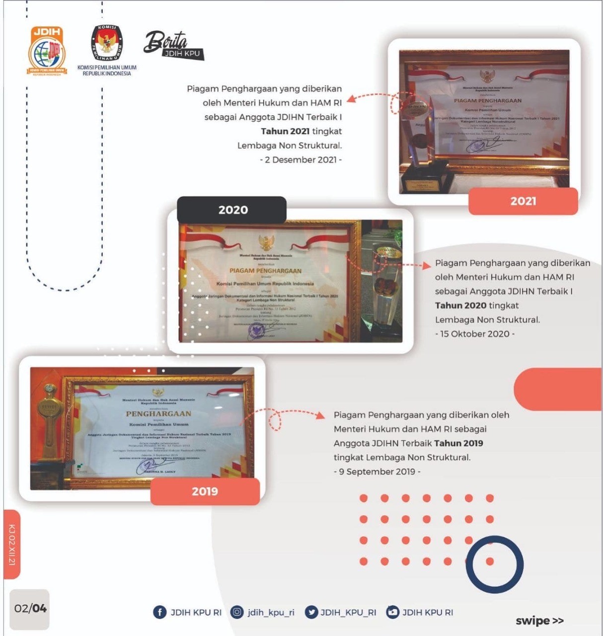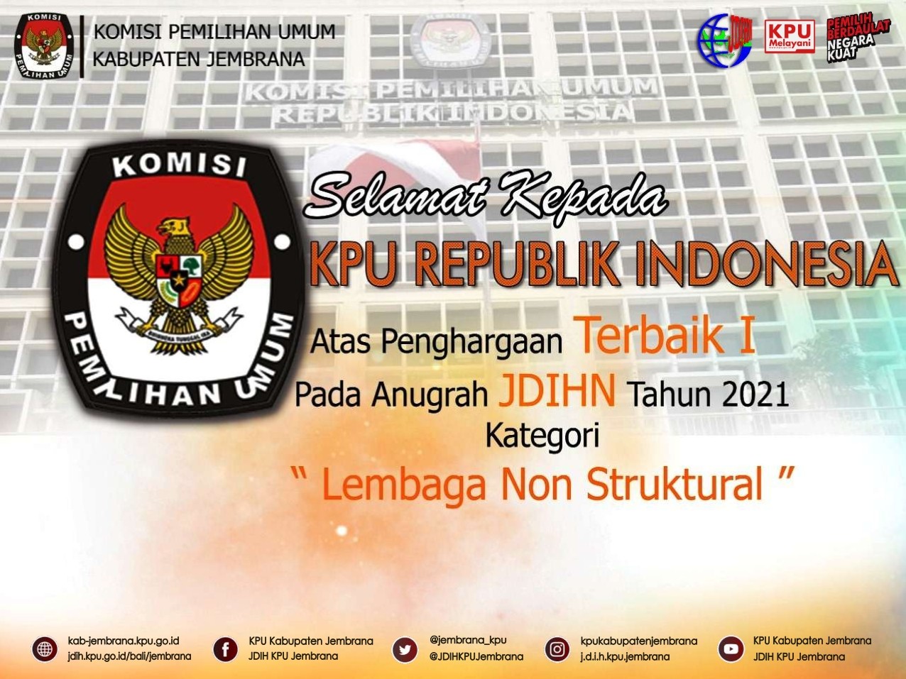 Dalam acara ini, diberikan penghargaan kepada Anggota JDIHN pada tahun 2021 atas hasil pengelolaan dan penyajian masing-masing JDIH para Anggota dalam tahun 2020. Dalam Kategori Lembaga Non Struktural, JDIH KPU Republik Indonesia mendapat anugrahi Terbaik I. Award ini diraih kali ketiga untuk JDIH KPU RI sebagai Anggota JDIHN Terbaik yaitu tahun 2019, 2020, 2021. (dp-red/jdih.kpujembrana)