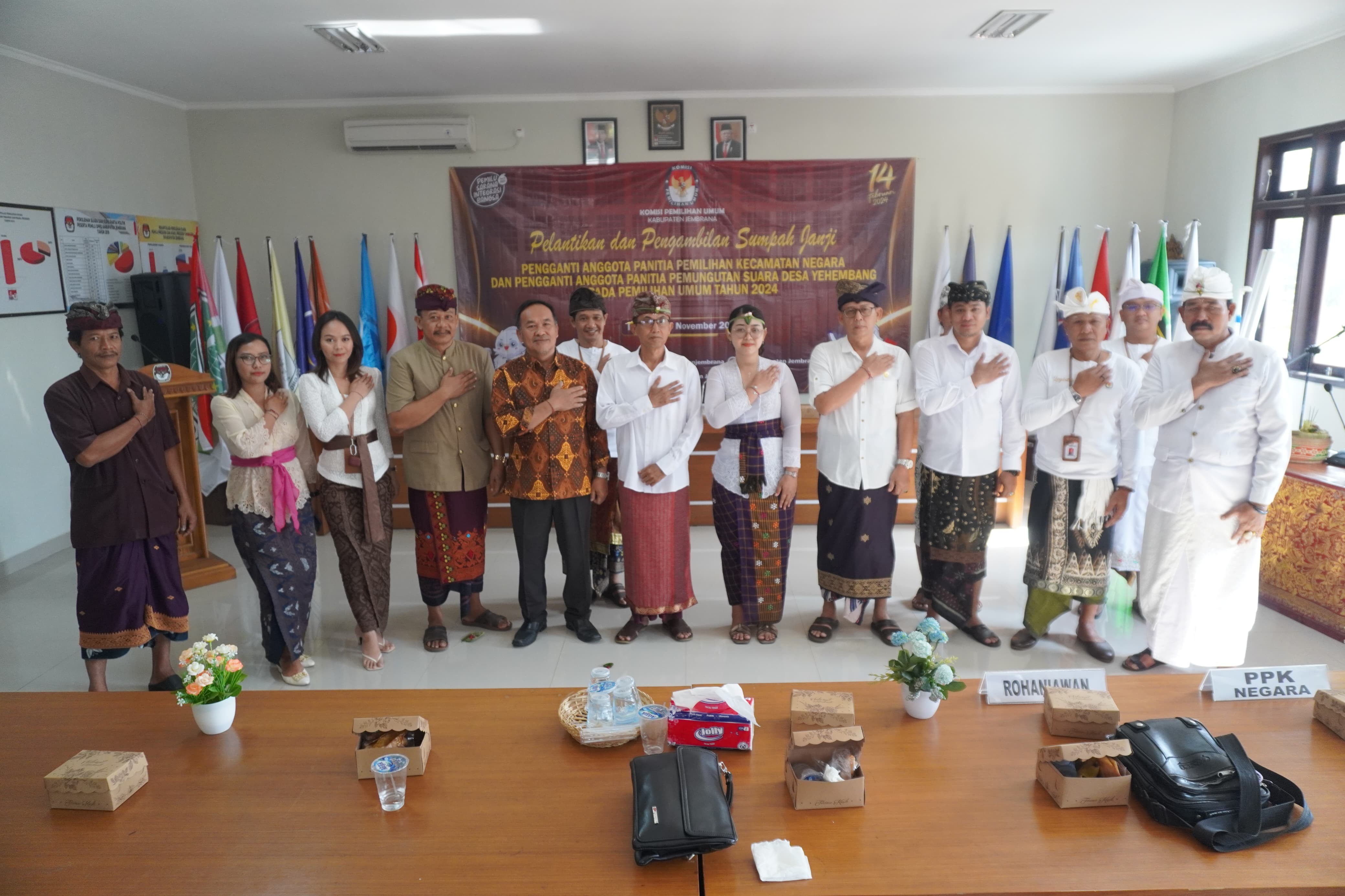 #TemanPemilih - Jembrana, 10 November 2023 , Komisi Pemilihan Umum (KPU) Jembrana melaksanakan pelantikan Panitia Pemilihan Kecamatan (PPK), Kecamatan Negara dan Panitia Pemungutan Suara (PPS) Desa Yehembang. Penggantian ini menjadi sebuah tindakan yang diperlukan setelah Ketua PPK Kecamatan Negara (Gusti Ayu Putu Sudiastari), terpilih Menjadi Anggota KPU Jembrana periode 2023-2028, dan PPS Yehembang Ni Putu Artami, mengundurkan diri. Keputusan pengunduran diri ini telah disampaikan kepada KPU Jembrana dan mendapat persetujuan.