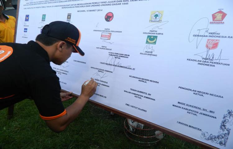 Partai Politik, Panwaslu Kabupaten Jembrana, KPU Kabupaten Jembrana dan Forum Komunikasi Pimpinan Daerah serta Pimpinan Pemuka Agama di Kabupaten Jembrana, mendeklarasikan dan menandatangani Deklarasi Kampanye Berinteritas pada acara Kirab Pemilu 2014 yang diadakan oleh KPU Kabupaten Jembrana pada hari Sabtu, 15 Maret 2014 di Lapangan Pergung Kecamatan Mendoyo Kabupaten Jembrana.