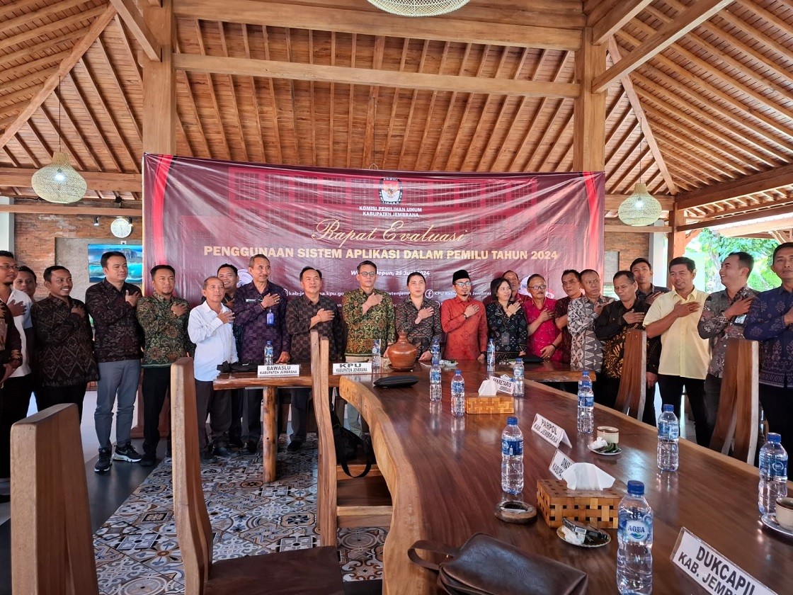 Jembrana - Komisi Pemilihan Umum (KPU) Kabupaten Jembrana mengadakan rapat evaluasi penggunaan aplikasi dalam Pemilu 2024. Kegiatan ini berlangsung di Warung Jepun Tembles dan dihadiri oleh berbagai pihak terkait.