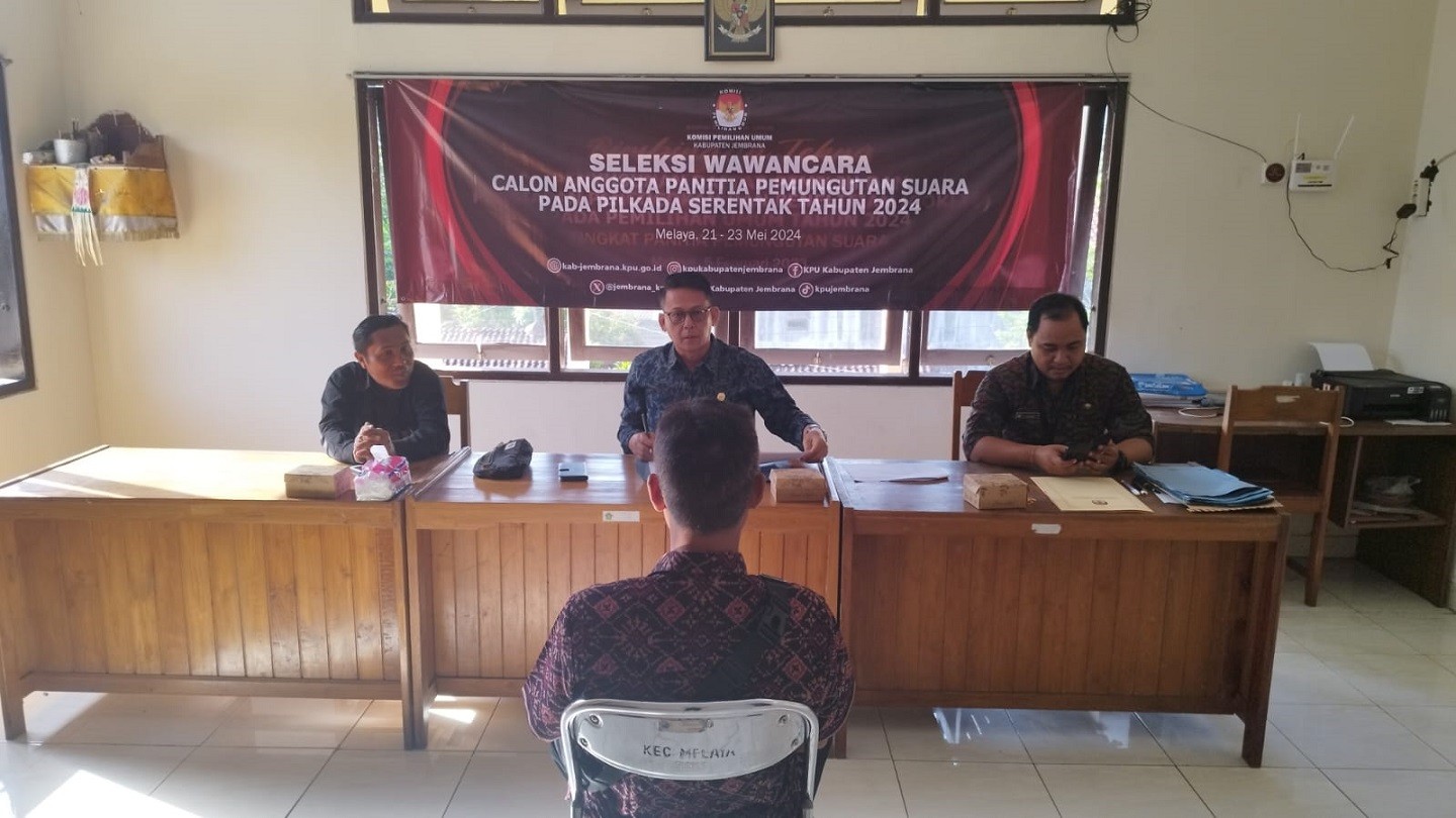 Jembrana, 21 Mei 2024 - Komisi Pemilihan Umum (KPU) Jembrana memulai kegiatan seleksi wawancara bagi calon anggota Panitia Pemungutan Suara (PPS) yang dilaksanakan serentak di kantor kecamatan masing-masing wilayah. Kegiatan ini direncanakan berlangsung selama tiga hari, mulai dari tanggal 21 hingga 23 Mei 2024.