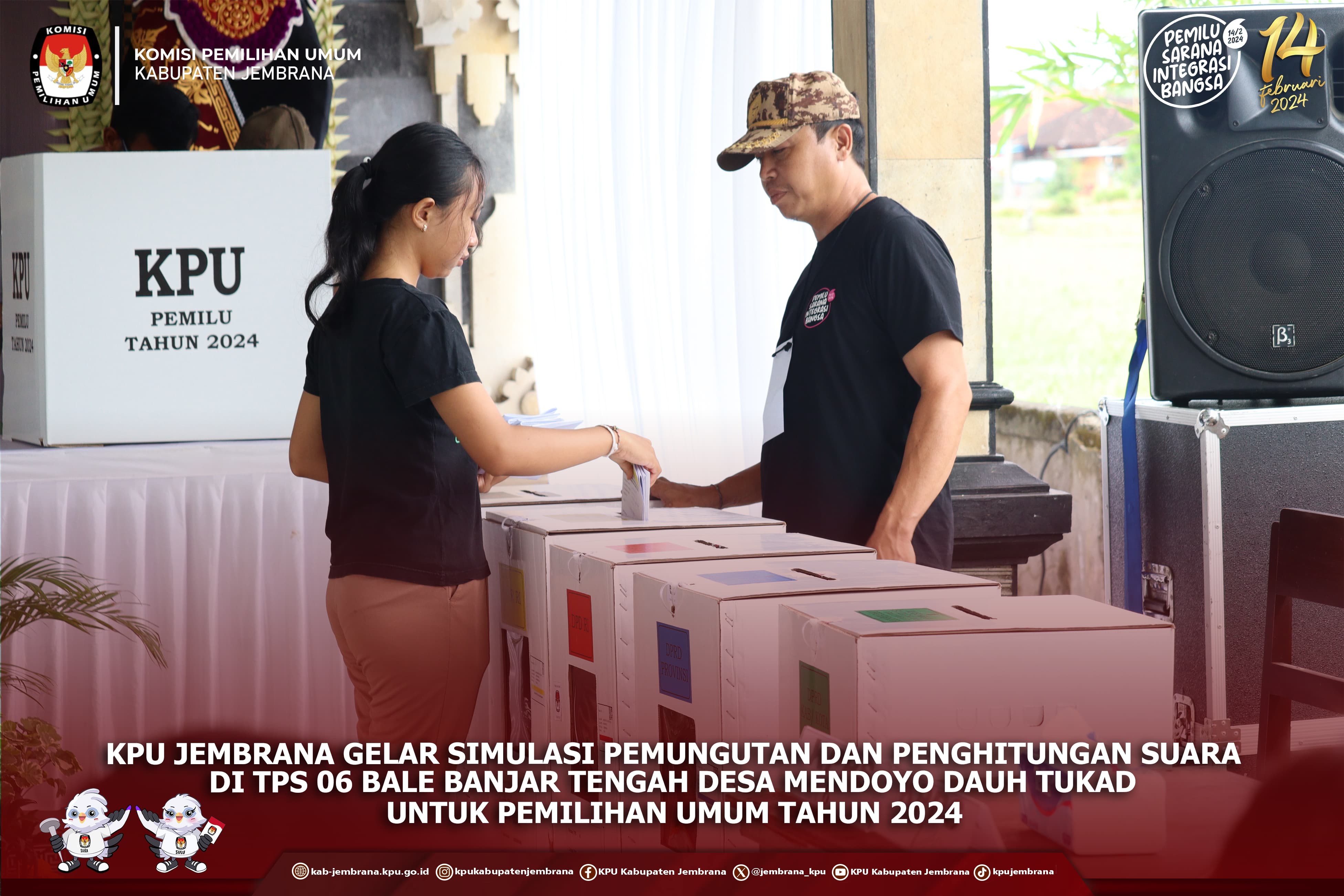 Jembrana, - Komisi Pemilihan Umum (KPU) Jembrana kembali menggelar simulasi pemungutan dan penghitungan suara sebagai bagian dari persiapan menghadapi Pemilihan Umum 2024. Simulasi kali ini dilaksanakan pada hari Rabu, (24/1/2024), di Tempat Pemungutan Suara (TPS) 6 Desa Mendoyo Dauh Tukad.