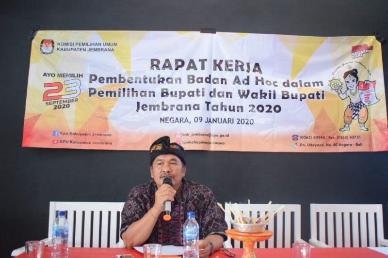 Dalam rangka Pemilihan Bupati dan Wakil Bupati Jembrana Tahun 2020 dan sesuai tahapan,program dan jadwal mengenai pembentukan Badan Ad hoc, KPU Jembrana melaksanakan Rapat Kerja Pembentukan Badan Ad hoc di Resto Ratu, Jl. Ngurah Rai No.111, Dauhwaru, Jembrana. Hadir dalam rapat kerja Ketua Bawaslu Kabupaten Jembrana, Kepala Dinas Kesehatan Kabupaten Jembrana, Kepala Dinas Kependududkan dan Catatan Sipil Kabupaten Jembrana, Kepala Dinas Pendididkan Kabupaten Jembrana, Kepala kantor Kesbangpol Kabupaten Jembrana, Camat se-Kabupaten Jembrana dan Kepala Desa/Lurah Se-Kabupaten Jembrana. Acara dimulai pukul 10.00 WITA diawali dengan menyanyikan lagu kebangsaan Indonesia Raya dan Doa.