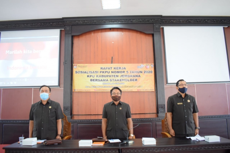 KPU Jembrana melaksanakan sosialisasi PKPU No 5 tahun 2020, kegiatan ini mengundang stakeholder terkait yaitu Forkominda (Bupati dan Wakil Bupati Jembrana, DPRD Kabupaten Jembrana, Kapolres Jembrana, Dandim 1617 Jembrana, Kejaksaan Negeri Jembrana, Pengadilan Negeri Negara), Bawaslu, Gugus Tugas Percepatan Penanganan Covid 19 Kabupaten Jembrana dan Pimpinan Partai Politik Kabupaten Jembrana