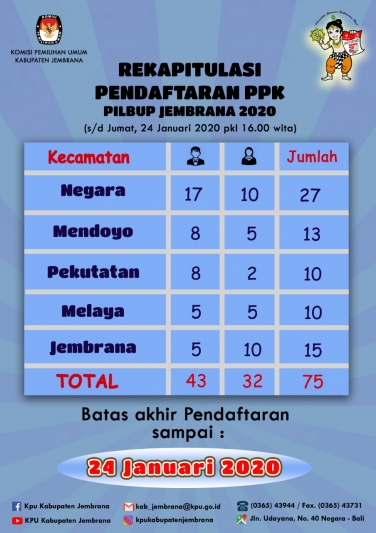 Setelah menunggu hingga hari terakhir batas penyerahan formulir pendaftaran Calon Anggota PPK, akhirnya terpenuhi kuota pendaftar di masing-masing Kecamatan. Hal ini dikatakan oleh made Widiastra anggota KPU Kabupaten Jembrana Divisi Sosialisasi SDM dan Parmas. "Jumlah pendaftar PPK untuk Pilkada Jembrana 2020 hingga hari ini mencapai 75 orang, dan ini sudah terpenuhi kuota minimal 2 (dua) kali jumlah PPK yang dipersyaratkan sesuai ketentuan, dengan rincian sebagai berikut, Kecamatan Negara 27 orang mendoyo 13 orang pekutatan 10 orang melaya 10 orang dan kecamatan Jembrana 15 orang." Data ini disampaikan setelah batas akhir pendaftaran PPK, yakni pukul 16.00 Wita. "Dengan demikian pendaftaran untuk PPK Pilkada Jembrana 2020 dapat ditutup dan selanjutnya akan dilakukan penelitian terhadap berkas calon yang diserahkan." Lanjut Widiastra. Untuk diketahui bahwa hasil penelitian berkas calon akan diumumkan pada tanggal 28 januari 2020. Bagi yang dinyatakan lolos administrasi selanjutnya akan mengikuti seleksi tertulis. Dan masyarakat dapat memberikan tanggapan terhadap calon tersebut secara tertulis disampaikan kepada KPU Kabupaten Jembrana Jalan Udayana no 40 Negara.