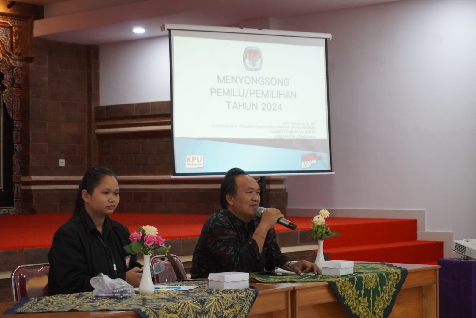 #TemanPemilih – Selasa (9/8). Kali ini KPU Jembrana melaksanakan sosialisasi ke Universitas Triatma Mulya yang sedang menjalankan kegiatan pada Masa Pengenalan Kehidupan Kampus Mahasiswa (PKKMB). Sebagai Anggota KPU Jembrana yang membidangi Divisi Sosdiklih,Parmas dan SDM Made Widiastra mengajak mahasiswa-mahasiswi sebagai generasi muda melineal ikut membangun demokrasi yang lebih baik.