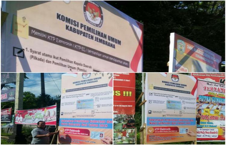 KPU Jembrana melaksanakan monitoring pemasangan Baliho Sosialisasi Daftar Pemilih untuk kepentingan Pemilihan Gubernur dan Wakil Gubernur Tahun 2018. Monitoring dilaksanakan untuk mengecek pemasangan sudah sesuai zona dan tiang penyangga baliho sudah kuat ataukah belum. Dari pelaksanaan monitoring yang dilakuka oleh 3 team KPU Jembrana semua Baliho sudah terpasang di zona yang bagus dan tiang penyangga baliho sudah kuat.