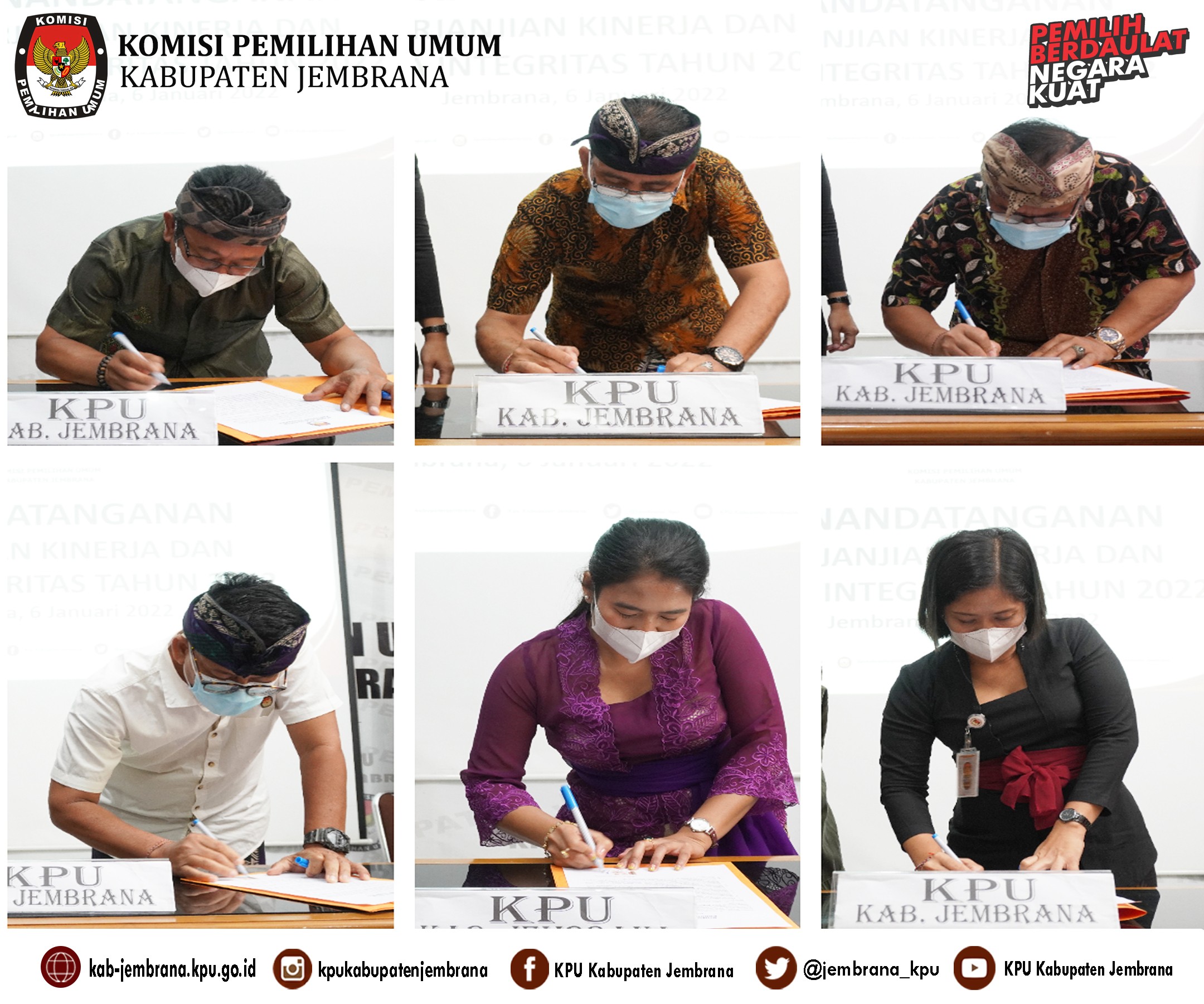 #TemanPemilih – Kamis (06/01). Seluruh jajaran KPU Kabupaten Jembrana Komisioner maupun Kesekretariatan melaksanakan penandatanganan Perjanjian Kinerja dan Fakta Integeritas Tahun 2022. Ini merupakan sebagai titik awal strategis dalam perbaikan kualitas demokrasi karena pemilu rentan dengan penyimpangan, godaan dan memiliki potensial dibajak oleh individu-individu yang tidak bertanggung jawab . Adapun sasaran strategis dari penandatagan ini adalah terwujudnya sumber daya manusia dan lembaga KPU yang berkualitas,terwujudnya kesadaran pemilih,Kepemiluan dan demokrasi yang tinggi untuk seluruh lapisan masyarakat serta terwujudnya koordinasi penyelenggara Kepemiluan yang sesuai dengan standar pelayanan publik disertai pengelolaan data dan informasi serta dokumentasi pelaksanaan pemilu berbasis teknologi informasi yang terintegrasi.