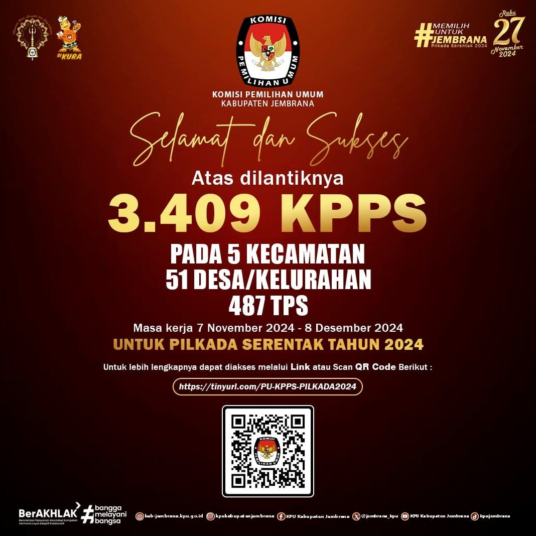 Selamat dan Sukses atas dilantiknya 3.409 Calon Terpilih Anggota KPPS Pemilihan Gubernur dan Wakil Gubernur Bali serta Bupati dan Wakil Bupati Jembrana Tahun 2024, pada 5 Kecamatan, 51 Desa/Kelurahan di 487 TPS.