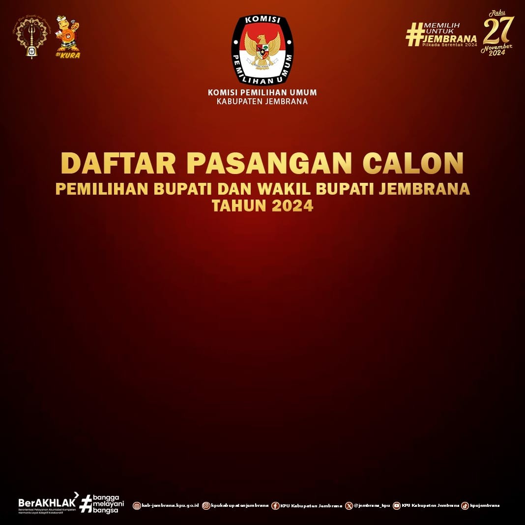 Komisi Pemilihan Umum Kabupaten Jembrana menerbitkan pengumuman terkait Daftar Pasangan Calon Pemilihan Bupati dan Wakil Bupati Jembrana Tahun 2024. Jumat 4 Oktober 2024
