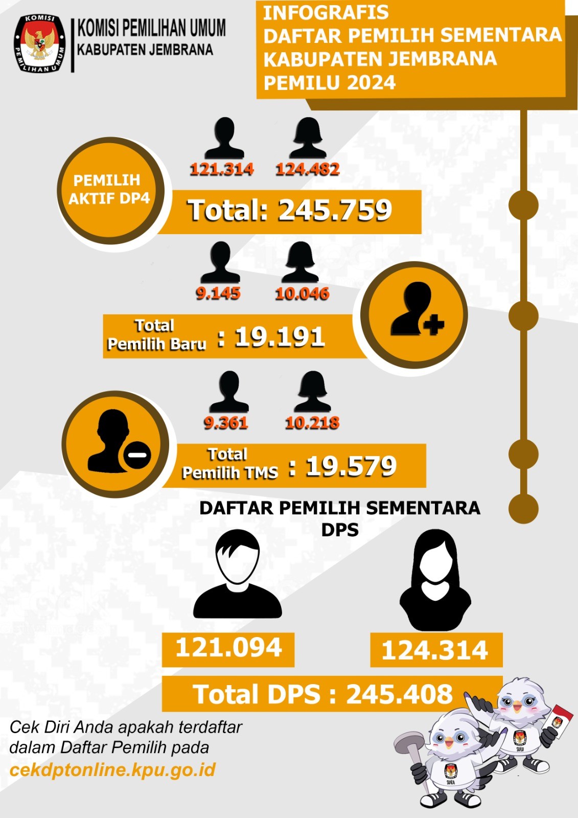 Berikut kami umumkan Rekapitulasi Daftar Pemilih Sementara (DPS) Pemilu Tahun 2024 sesuai dengan Berita Acara Nomor 363/PL.01.2-BA/5101/3/2023 Tentang Rekapitulasi Daftar Pemilih Sementara (DPS) Tingkat Kabupaten Jembrana Pemilihan Umum Tahun 2024, sebagaimana bisa diunduh pada link berikut ini :