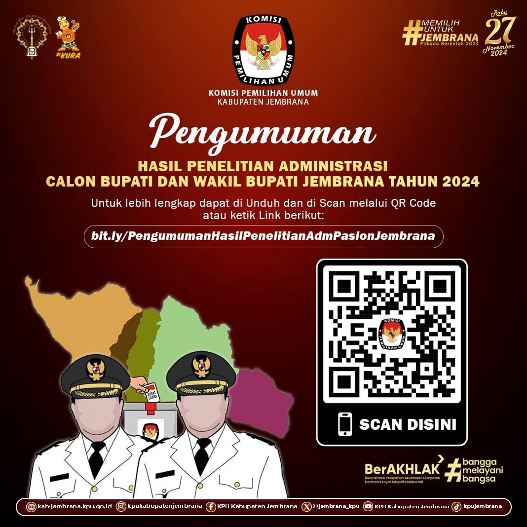 Berdasarkan Pasal 137 Peraturan Komisi Pemilihan Umum Nomor 8 Tahun 2024 tentang Pencalonan Gubernur dan Wakil Gubernur, Bupati dan Wakil Bupati, serta Walikota dan Wakil Walikota, sebagaimana telah diubah dengan Peraturan Komisi Pemilihan Umum Nomor 10 Tahun 2024 tentang Perubahan atas Peraturan Komisi Pemilihan Umum Nomor 8 Tahun 2024 tentang Pencalonan Gubernur dan Wakil Gubernur, Bupati dan Wakil Bupati, serta Walikota dan Wakil Walikota, Komisi Pemilihan Umum Kabupaten Jembrana mengumumkan hasil penelitian persyaratan administrasi Calon Bupati dan Wakil Bupati Jembrana Tahun 2024, sesuai dengan Pengumuman Nomor : 1133/PL.02.2-Pu/5101/2/2024, dapat diunduh pada link berikut ini :