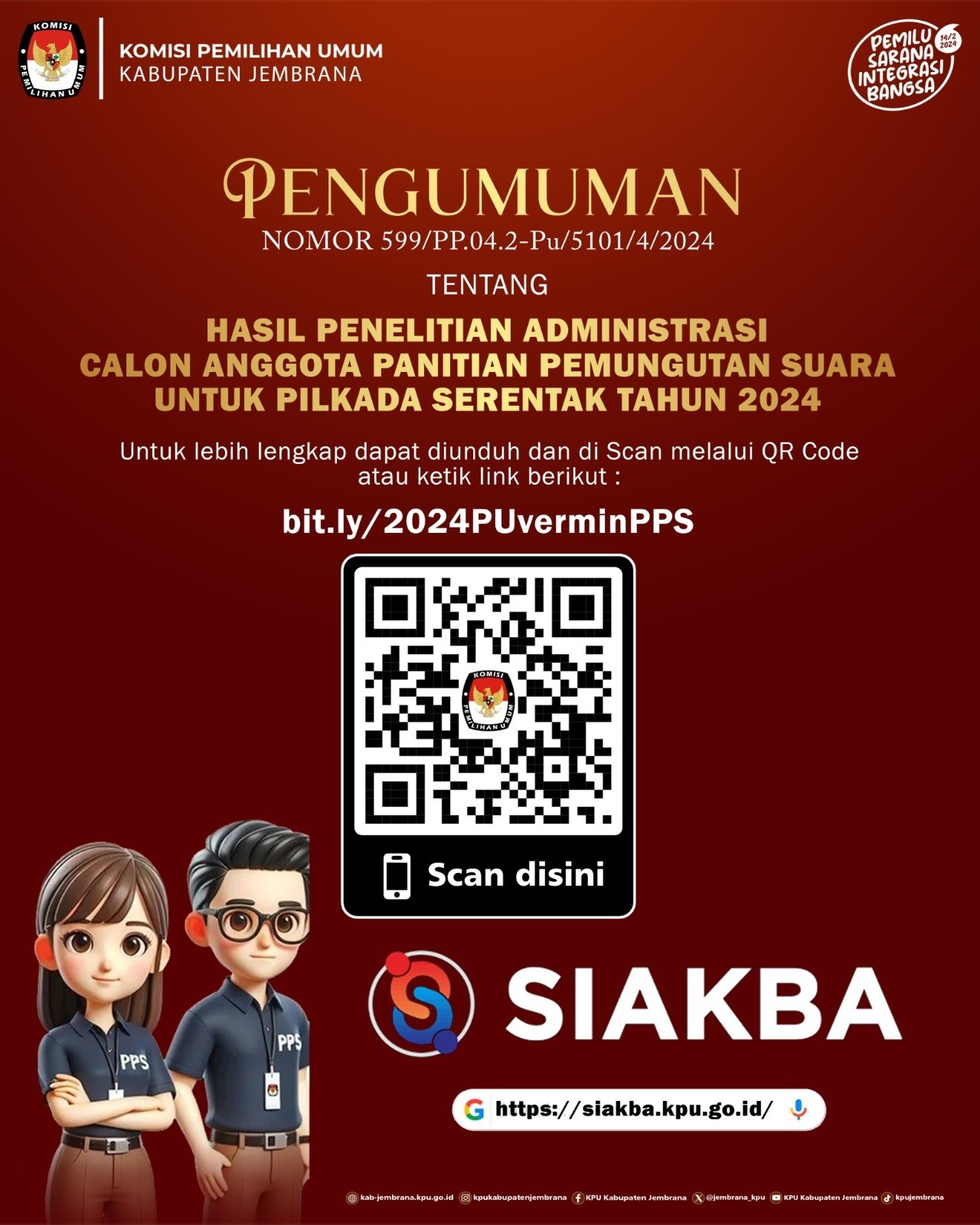 Pengumuman KPU Kabupaten Jembrana Nomor 599/PP.04.2-Pu/5101/4/2024 tanggal 13 Mei 2024 tentang Hasil Penelitian Administrasi Calon Anggota Panitia Pemungutan Suara (PPS) untuk Pemilihan Gubernur dan Wakil Gubernur, dan Bupati dan Wakil Bupati pada Kabupaten Jembrana Tahun 2024