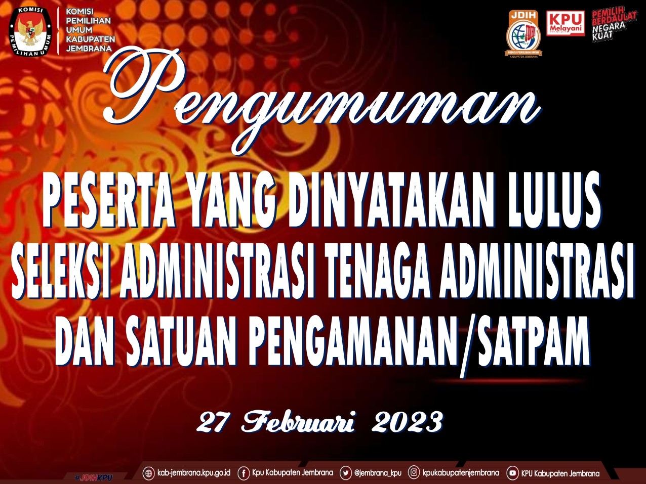 Berikut kami Umumkan Nomor : 242/SDM.02.1-Pu/5101/4/2023, Tentang Peserta yang dinyatakan lulus Administrasi Tenaga Administrasi dan Satuan Pengamanan ( Jagat Saksana ) Sekretariat KPU Kabupaten Jembrana, dapat diunduh pada link berikut ini :