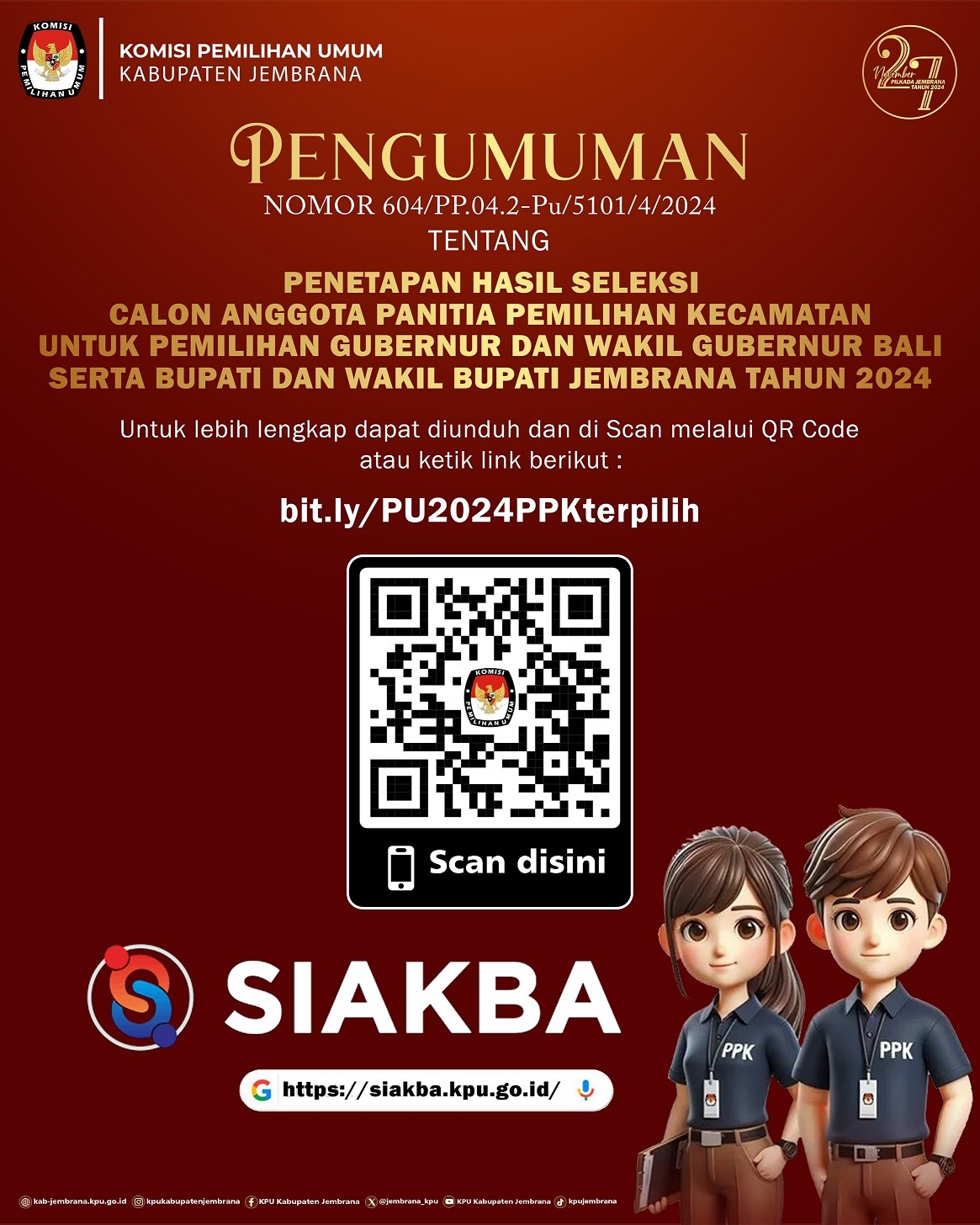 Pengumuman KPU Kabupaten Jembrana Nomor 604/PP.04.2-Pu/5101/4/2024 tanggal 14 Mei 2024 tentang Penetapan Hasil Seleksi Calon Anggota Panitia Pemilihan Kecamatan untuk Pemilihan Gubernur dan Wakil Gubernur Bali, serta Bupati dan Wakil Bupati Jembrana Tahun 2024.