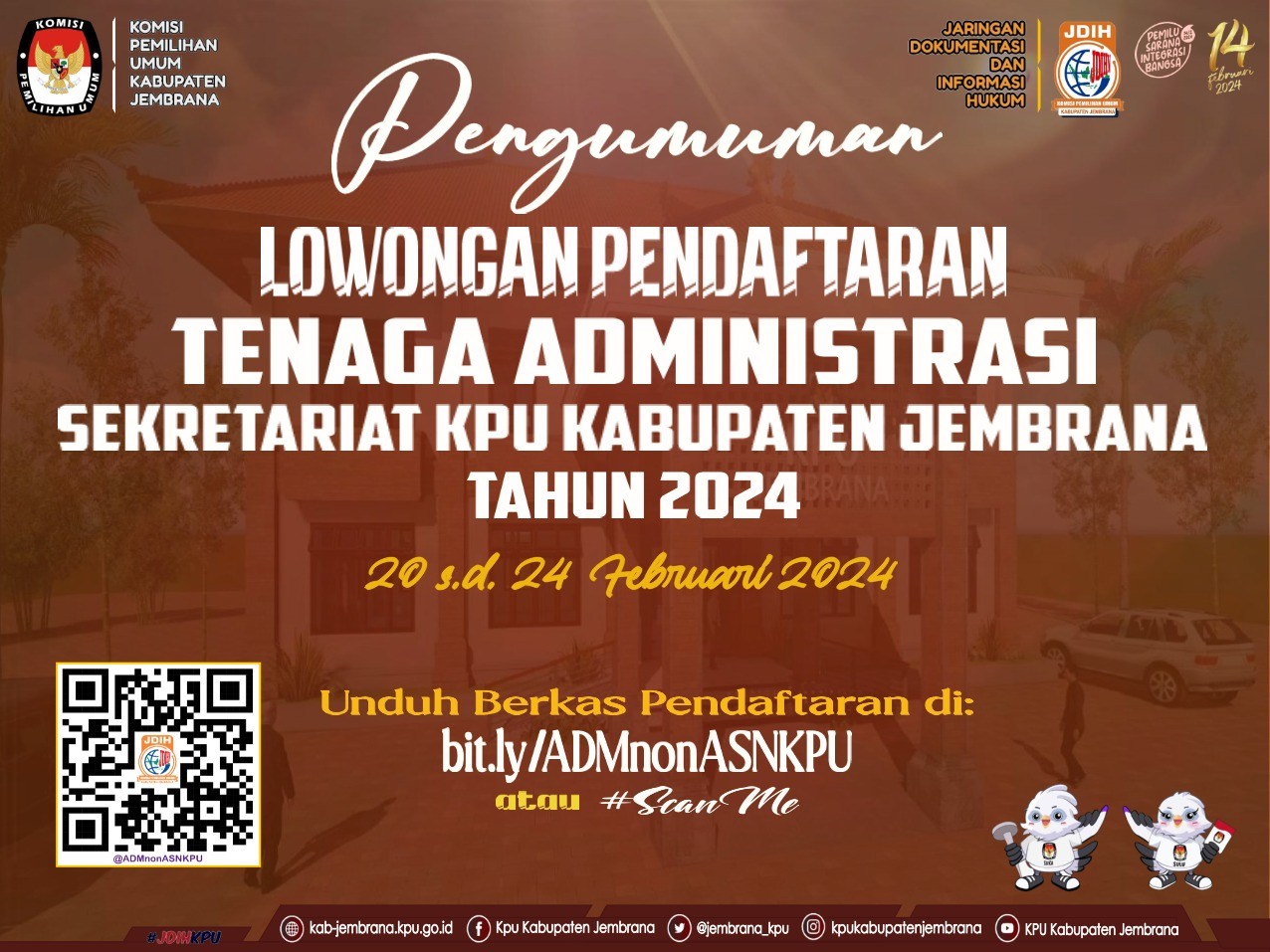 Pengumuman Lowongan Pendaftaran Tenaga Admministrasi Sekretariat KPU Kabupaten Jembrana Tahun 2024 Senin, 19 Februari 2024 17:00 86 http://bit.ly/ADMnonASNKPU Bagikan: Dilihat 86 Kali.