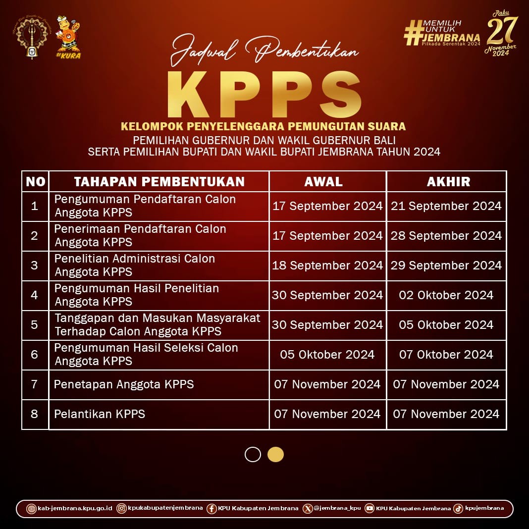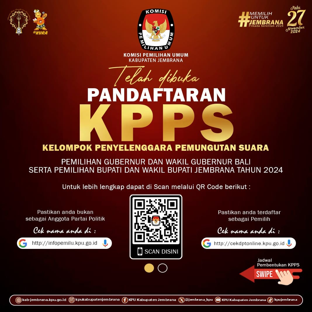 Telah dibuka pendataran Kelompok Penyelenggara Pemungutan Suara (KPPS) Pemilihan Gubernur dan Wakil Gubernur Bali serta Pemilihan Bupati dan Wakil Bupati Jembrana Tahun 2024.