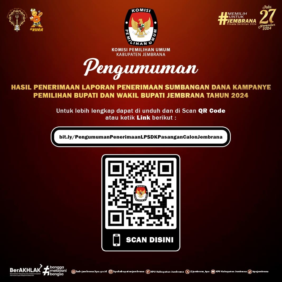 Berdasarkan Tanda Terima dan Berita Acara Penerimaan LPSDK Pasangan Calon Bupati dan Wakil Bupati Jembrana Tahun 2024 di KPU Kabupaten Jembrana, diumumkan hasil penerimaan LPSDK sebagai berikut :