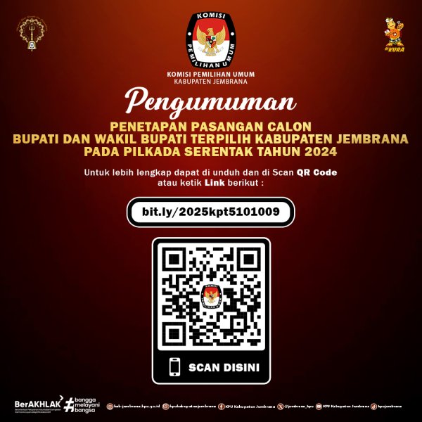 Berikut kami umumkan Penetapan Calon Terpilih Pilkada Serentak Tahun 2024 sesuai dengan Surat Keputusan KPU Kabupaten Jembrana Nomor 9 Tahun 2025, dapat diunduh pada link berikut ini :