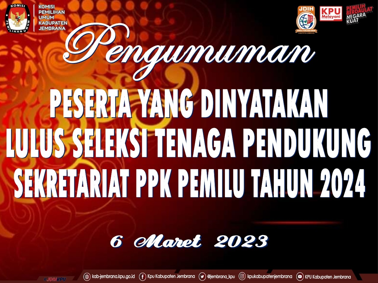 Pengumuman Nomor : 299/SDM.02.1-BA/5101/4/2023 tanggal 6 Maret 2023 tentang Peserta Yang Dinyatakan Lulus Seleksi Tenaga Pendukung Sekretariat Panitia Pemilihan Kecamatan se-Kabupaten Jembrana untuk Pemilihan Umum Tahun 2024, Dapat diunduh pada link berikut ini :