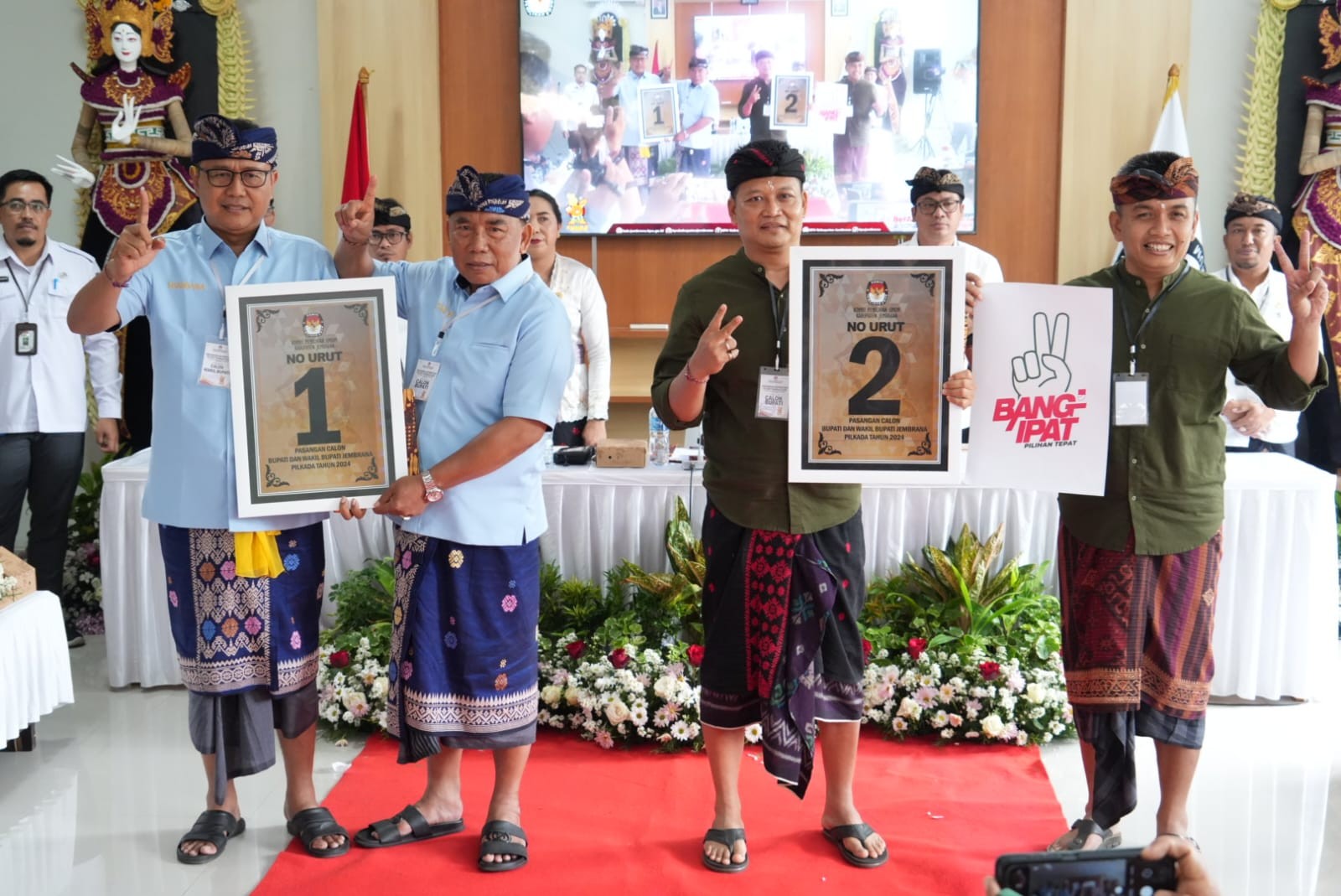 Setelah proses pengundian, pasangan Bang-Ipat berhasil mendapatkan nomor undian 9, sementara pasangan Tamba-Dana memperoleh nomor undian 12. Dengan hasil ini, pasangan Bang-Ipat mengambil nomor urut terlebih dahulu, disusul oleh pasangan Tamba-Dana. Nomor urut dibuka bersama disaksikan media dan seluruh tamu undangan. Hasil dari pengundian nomor urut pasangan calon bupati dan wakil bupati Jembrana 2024 didapat bahwa pasangan calon bupati dan wakil bupati Jembrana 2024 nomor urut 1 adalah I Nengah Tamba, S.H., M.M. dan I Made Suardana, S.T., M.Sos., M.I.Kom, sedangkan nomor urut 2 adalah I Made Kembang Hartawan, S.E., M.M. dan I Gede Ngurah Patriana Krisna, S.T., M.T.