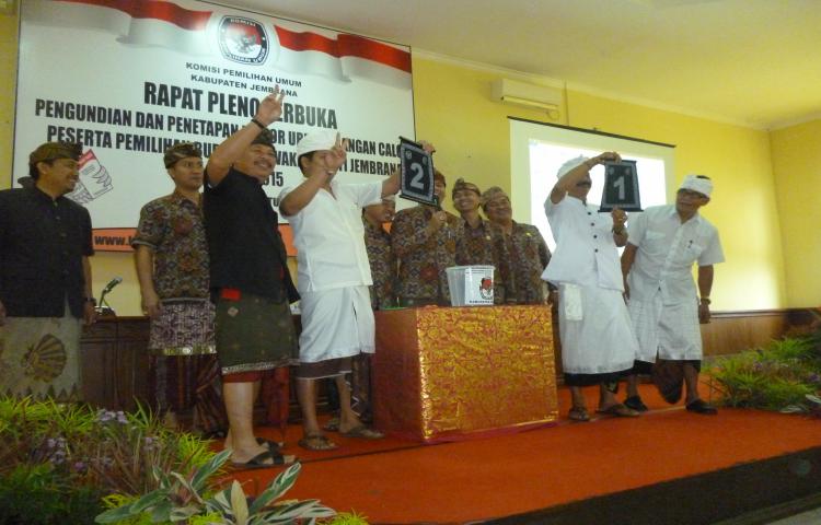 KPU Kabupaten Jembrana melaksanakan Pengundian, Penetapan dan Pengumuman Nomor Urut Pasangan Calon Dalam Pemilihan Bupati dan Wakil Bupati Jembrana Tahun 2015 yang dilaksanakan di Gedung Kesenian Bung Karno di buka oleh Ketua KPU Jembrana didampingi Ketua KPU Provinsi Bali beserta seluruh Anggota KPU Kabupaten Jembrana pada pukul 11.00 WITA. Rapat Pleno dihadiri dari Ketua DPRD Kabupaten Jembrana, Kapolres Jembrana, Dandim 1617, Kajari Jembrana, Ketua Pengadilan Negeri Jembrana, Panwas Kabupaten Jembrana, PPK Se-Kecamatan Jembrana, Pasangan calon beserta Tim Pemenangan masing-masing Pasangan Calon. Setelah acara dibuka dilanjutkan dengan pembacaan Tata Tertib, Pengundian Nomor Urut, Pembacaan SK Penetapan Nomor Urut dan Penandatangan Kesepakan Damai serta Berita Acara Penetapan Nomor Urut oleh Ketua KPU Kabupaten Jembrana, kedua Pasangan Calon, Panwas Kabupaten Jembrana dan unsur Muspida. Rapat Pleno Berjalan dengan aman, lancar sesuai dengan susunan acara dan ditutup oleh Ketua KPU Jembrana Pukul 13.00 WITA