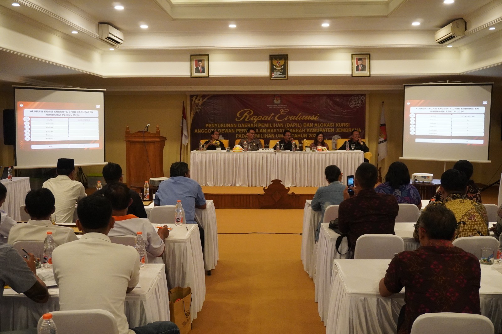 Pemaparan materi yang dibawakan Ketua Divisi Teknis Penyelanggara KPU Jembrana I Ketut Adi Sanjaya terkait daerah pemilihan dan kegiatan hari ini wajib dilaksanakan sesusi dengan surat dinas KPU RI no 249 tahun 2023 terkait Evaluasi Daerah Pemilihan dan Alokasi Kursi Pemilu 2024, untuk mengetahui masukan dari semua undangan terkait pelaksanaan penyusunan DAPIL. DAPIL yang sudah ditetapkan untuk di Kabupaten Jembrana terdiri dari 5 dapil dan 35 alokasi kursi. DAPIL 1 Kecamatan Negara, DAPIL 2 Kecamatan Melaya, DAPIL 3 Kecamatan Pekutatan, DAPIL 4 Kecamatan Mendoyo dan DAPIL 5 Kecamatan Jembrana.