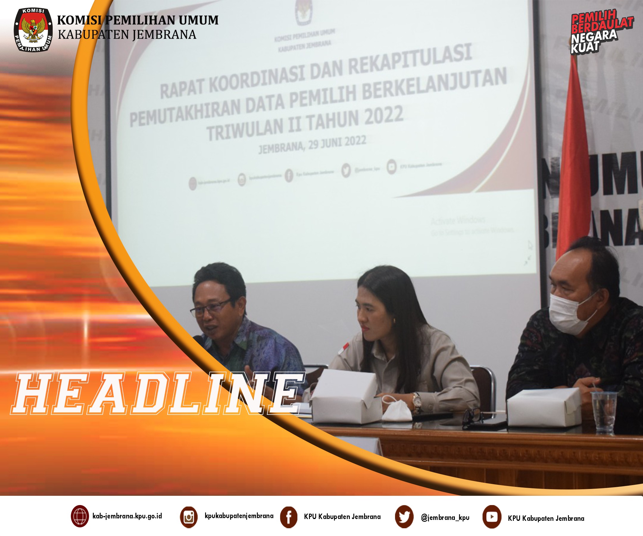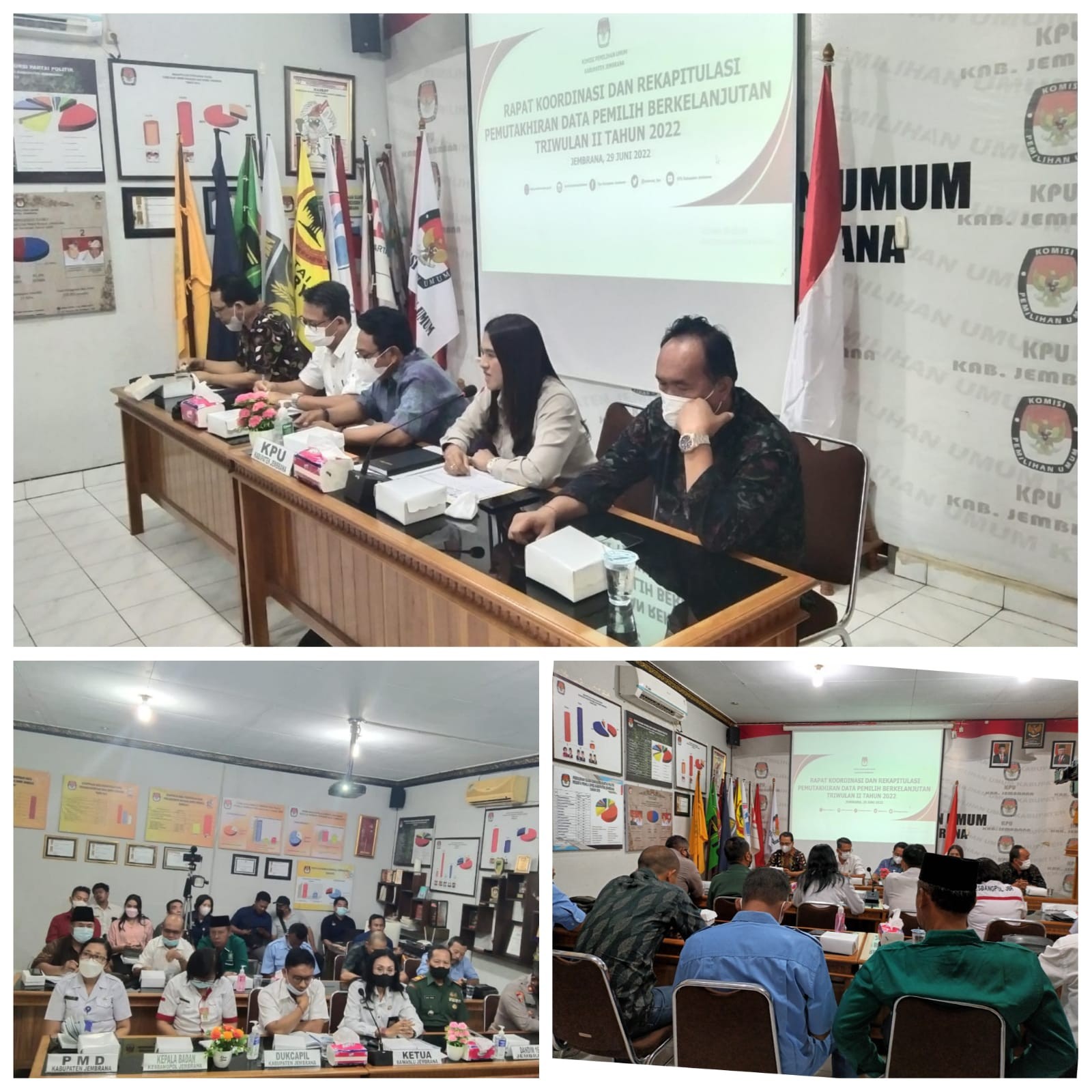 Berdasarkan ketentuan Peraturan Komisi Pemilihan Umum Republik Indonesia Nomor 6 Tahun 2021, Tanggal 11 Bulan Nopember Tahun 2021 Tentang Pemutakhiran Data Pemilih Berkelanjutan, hasil rapat koordinasi yang dilakukan oleh Komisi Pemilihan Umum Kabupaten Jembrana menghasilkan hal sebagai berikut, Rekapitulasi Pemutakhiran Data Pemilih Berkelanjutan Triwulan II Tahun 2022 dengan jumlah pemilih sebanyak 237.546 (Dua Ratus Tiga Puluh Tujuh Ribu Lima Ratus Empat Puluh Enam) pemilih dengan rincian pemilih laki-laki berjumlah 117.731 (Seratus Tujuh Belas Ribu Tujuh Ratus Tiga Puluh Satu) pemilih dan pemilih perempuan berjumlah 119.815 (Seratus Sembilan Belas Ribu Delapan Ratus Lima Belas) pemilih, yang tersebar di 5 (Lima) Kecamatan, dan 51 (Lima Puluh Satu) Desa/Kelurahan.