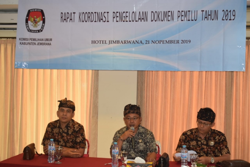 KPU Jembrana (21/11), KPU Jembrana melaksanakan kegiatan Rapat Koordinasi Pengelolaan Dokumen Pemilu Tahun 2019 bertempat di Aula Anumerta Hotel Jimbarwana Jl. Udayana No. 2 Kelurahan Baler Bale Agung, Kecamatan Negara, Kabupaten Jembrana. Acara dimulai Pukul 10.00 WITA diawali dengan menyanyikan lagu indonesia raya dan doa. Acara dibuka oleh Ketua KPU Jembrana I Ketut Gde Tangkas Sudiantara. Dalam sambutannya Pak Tangkas sapaan akrabnya menjelaskan kegiatan seperti ini sangat penting dalam penataan dan pengelolaan arsip kedepannya sehingga data dan kegiatan per-kegiatan tersimpan dengan baik. Hadir dalam acara ini undangan dari LO Partai Politik, Narasumber, Komisioner KPU Jembrana dan seluruh pegawai Sekretariat KPU Jembrana.