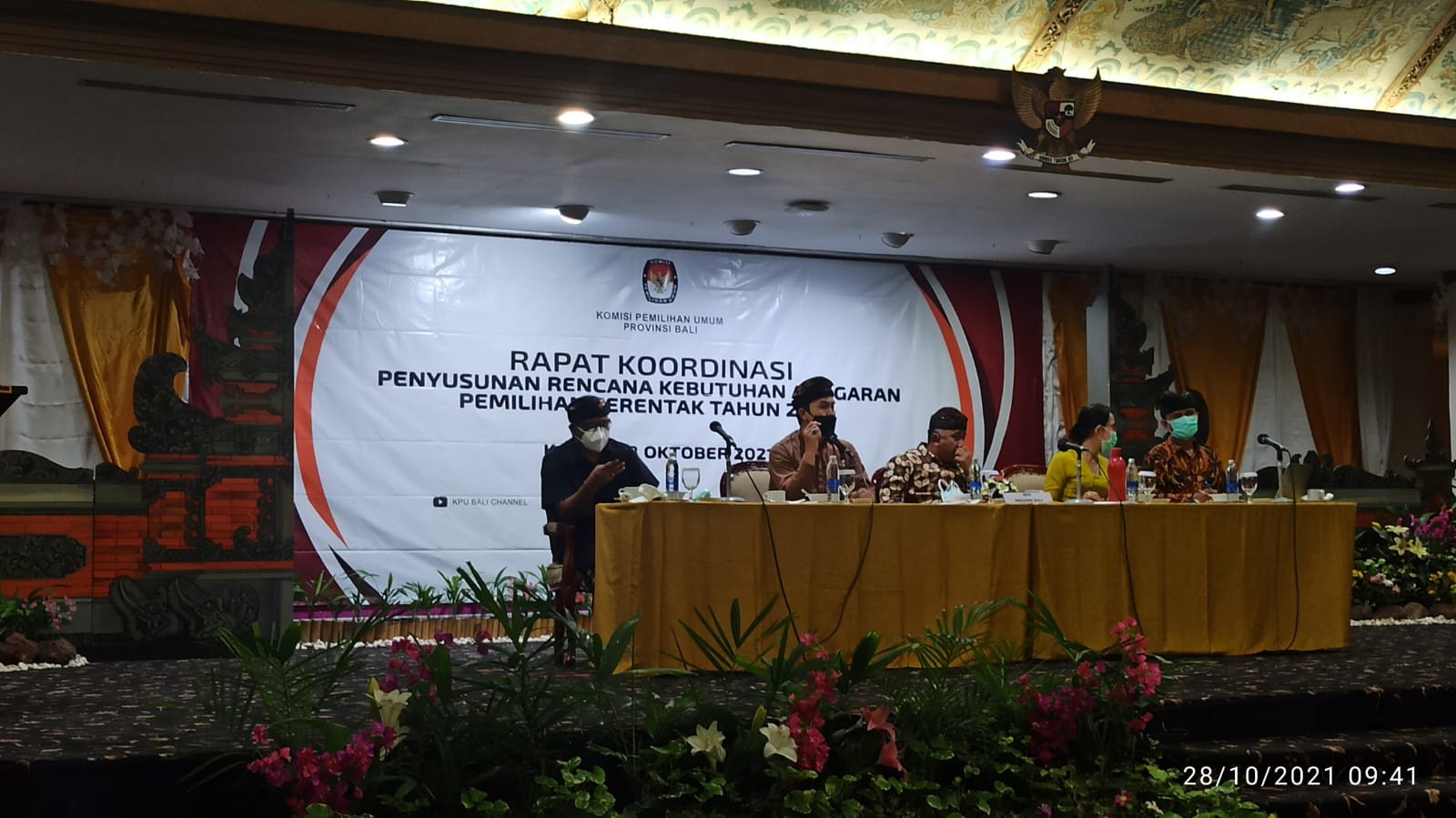 Rapat Koordinasi di mulai pukul 09.30 wita, di buka oleh Ketua KPU Provinsi Bali I Dewa Agung Gede Lidartawan. Rapat ini dihadiri pula Anggota dan Sekretaris KPU Provinsi Bali dan undangan dari Ketua dan Anggota Divisi Perencanaan Data dan Informasi dan Sekretaris KPU Kabupaten/Kota se-Bali.