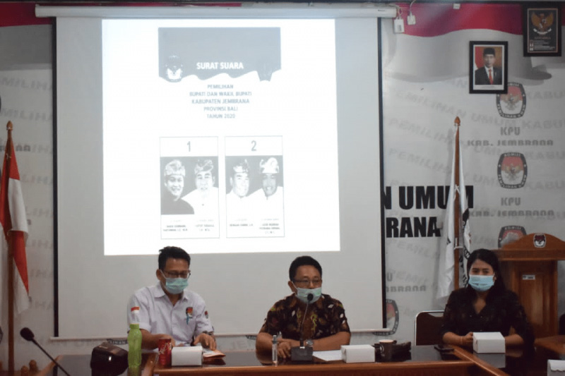 KPU Jembrana, Rabu (14/10). KPU Jembrana melaksanakan Rapat Koordinasi Persetujuan Design Surat Suara dan Alat Bantu Coblos Tuna Netra Pemilihan Bupati dan Wakil Bupati Jembrana Tahun 2020. Rapat di pimpin langsung oleh Ketua KPU Jembrana I Ketut Gde Tangkas Sudiantara didampingi Komisoner KPU Jembrana I Ketut Adi Sanjaya dan Ni Putu Angelia. Rapat dilaksanakan di ruang Rumah Pintar Pemilu Puri Demokrasi Jembrana Sekretariat Kantor KPU Jembrana dihadiri oleh undangan dari Bawaslu Jembrana, Kesbangpol Jembrana, Gugus Tugas Penanganan Covib, untuk Pasangan Calon urut 1 dihadiri I Ketut Sugiasa ( Calon Wakil Bupati ) didampingi oleh Tim Kampanye dan LO pasangan Calon sedang dan Pasangan Calon Nomor Urut 2 dihadiri oleh I Nengah Tamba ( Calon Bupati ) juga didampingi Tim Kampanye dan LO Pasangan Calon.