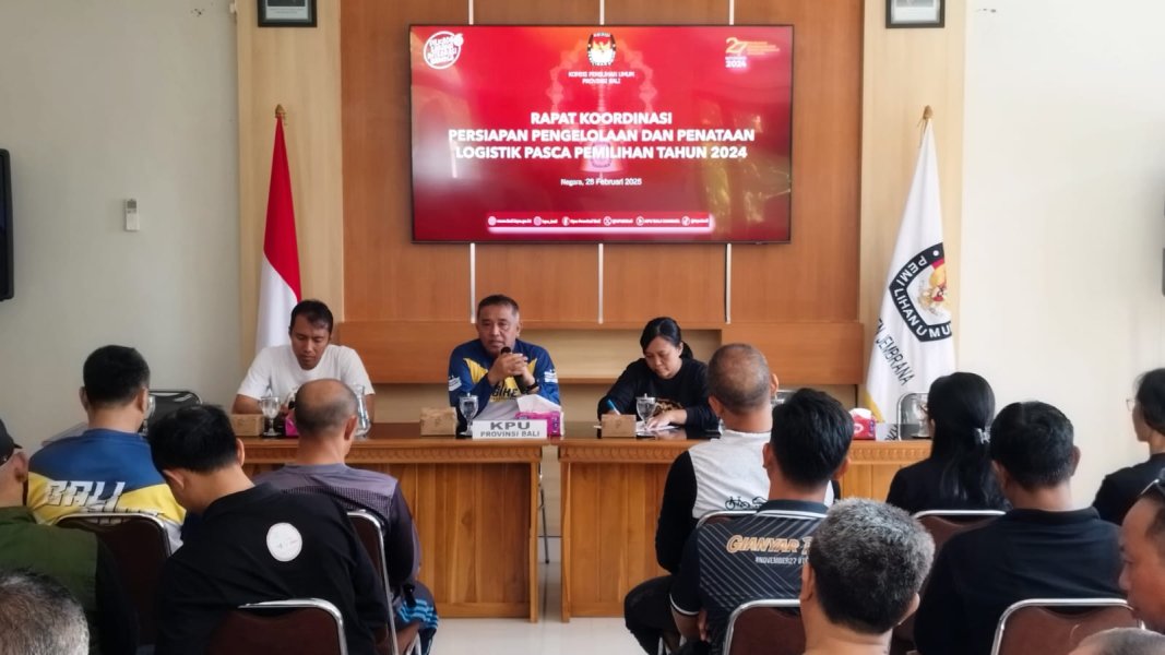 Jembrana, 28 Februari 2025 – Komisi Pemilihan Umum (KPU) Provinsi Bali menggelar Rapat Koordinasi dalam rangka persiapan pengelolaan dan penataan logistik pasca Pemilihan Tahun 2024. Kegiatan ini berlangsung di Kantor KPU Kabupaten Jembrana dan dihadiri oleh Ketua, Sekretaris, Kasubag Keuangan Umum dan Logistik, serta satu orang staf yang membidangi logistik dari KPU Kabupaten/Kota se-Bali.