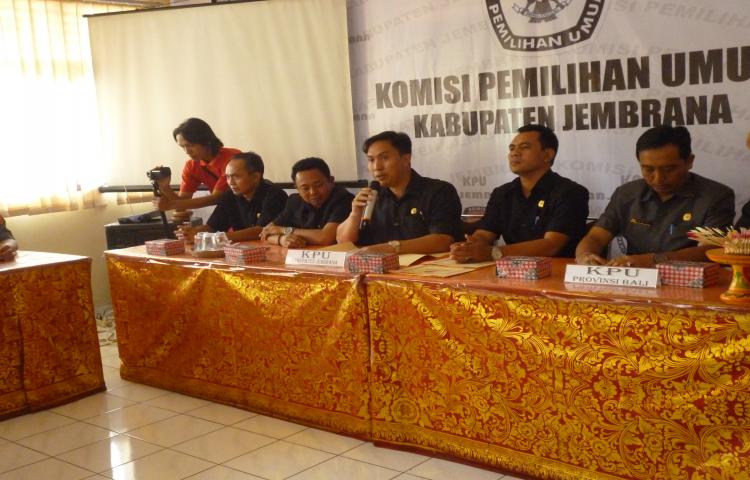 Pukul 13.00 s.d 13.30 WITA, KPU Kabupaten Jembrana mengadakan Rapat Pleno dipimpin oleh Ketua KPU Kabupaten Jembrana I Gusti Ngurah Agus Darmasanjaya,ST yang dihadiri seluruh Anggota KPU Kabupaten Jembrana dalam rangka penetapan Pasangan Calon Pemilihan Bupati dan Wakil Bupati Jembrana Tahun 2015. Selanjutnya pada pukul 14.00 WITA dilaksanakan Rapat Penyampaian hasil Rapat Pleno Pasangan Calon yang memenuhi syarat dan tidak memenuhi syarat verifikasi dalam Pemilihan Bupati dan Wakil Bupati Jembrana Tahun 2015. Rapat dibuka oleh Ketua KPU Kabupaten Jembrana didampingi seluruh Anggota KPU Kabupaten Jembrana serta dihadiri oleh Tim Kampanye Pasangan Calon, Panwaslih Kabupaten Jembrana, Ketua KPU Provinsi Bali I Dewa Kade Wiarsa Raka Sandi, ST, Kapolres Jembrana, Dandim 1617/Jembrana dan 2 Pasangan Calon yaitu Paket ABANG dan Paket SIGY. Ketua KPU Kabupaten Jembrana membacakan Berita Acara dan SK Penetapan Pasangan Calon yang memenuhi persyaratan dan tidak memenuhi persyaratan dan selanjutnya diserahkan kepada masing-masing Pasangan Calon dan Panwaslih Kabupaten Jembrana. Pande Made Adi Mulyawan,ST selaku Ketua Panwaslih Jembrana memberikan himbauan agar KPU Kabupaten Jembrana senantiasa selalu berkoordinasi dengan Panwaslih Jembrana sedangkan Kapolres Jembrana memberi himbauan Penyelenggara dan Peserta Pemilihan Bupati dan Wakil Bupati Tahun 2015 berjalan sesuai dengan rambu-rambu dan Peraturan Perundang-undangan. Ketua KPU Provinsi Bali juga mengharapkan agar Pemilihan berjalan dengan aman dan lancar sesuai dengan tahapan. Pukul 15.00 WITA Rapat selesai dan ditutup kembali oleh Ketua KPU Kabupaten Jembrana.