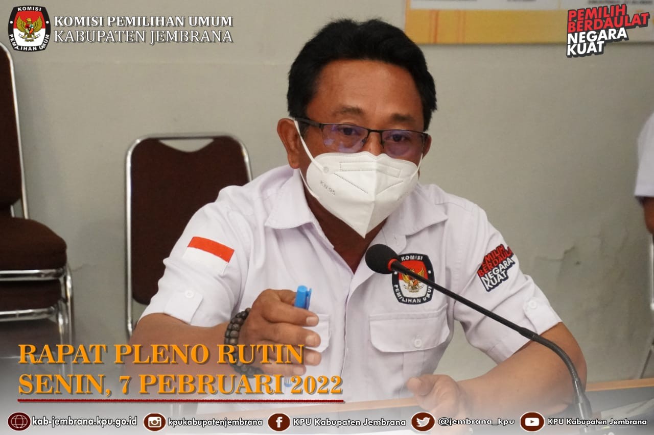 #TemanPemilih – Senin (07/02). Rapat PLeno Rutin Mingguan membahas agenda kegiatan yang akan dilaksanakan dalam minggu ini. Rapat diikuti oleh seluruh Komisioner , Sekretaris dan seluruh Kasubbag KPU Kabupaten Jembrana. Rapat diaksanakan di ruangan Puri Demokrasi Jembrana Kantor KPU Kabupaten Jembrana Jaln Udayana Nomor 40 Negara. Rapat dipimpin langsung oleh Ketua KPU Kabupaten Jembrana I Ketut Gde Tangkas Sudiantara dalam hal ini menekankan kegiatan penguatan kelembagaan yang dilaksanakan di hari jumat dilaksanakan dengan kegiatan olah raga untuk menjaga kebugaran tubuh dan selalu mematuhi Prokes untuk mehindari penyebaran virus covid yang melanda saat ini. Untuk kegiatan 2 tahun menyongsong Pemilu Serentak 2024 yang akan dilaksanakan pada hari senin (14/02) yang bertepatan dengan hari valentine Pak Tangkas meminta agar Sekretaris KPU Kabupaten Jembrana I Gusti Ayu Ardani bisa memfasilitasi secara maksimal kegiatan tersebut